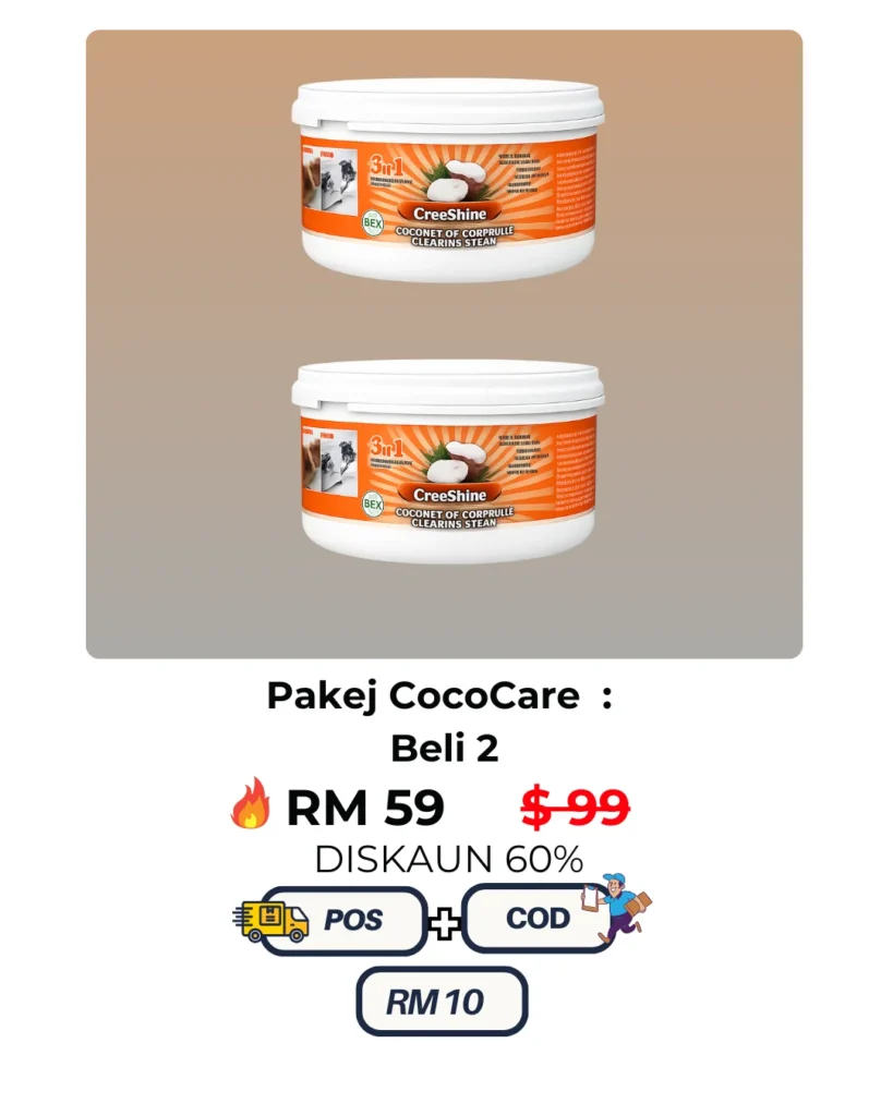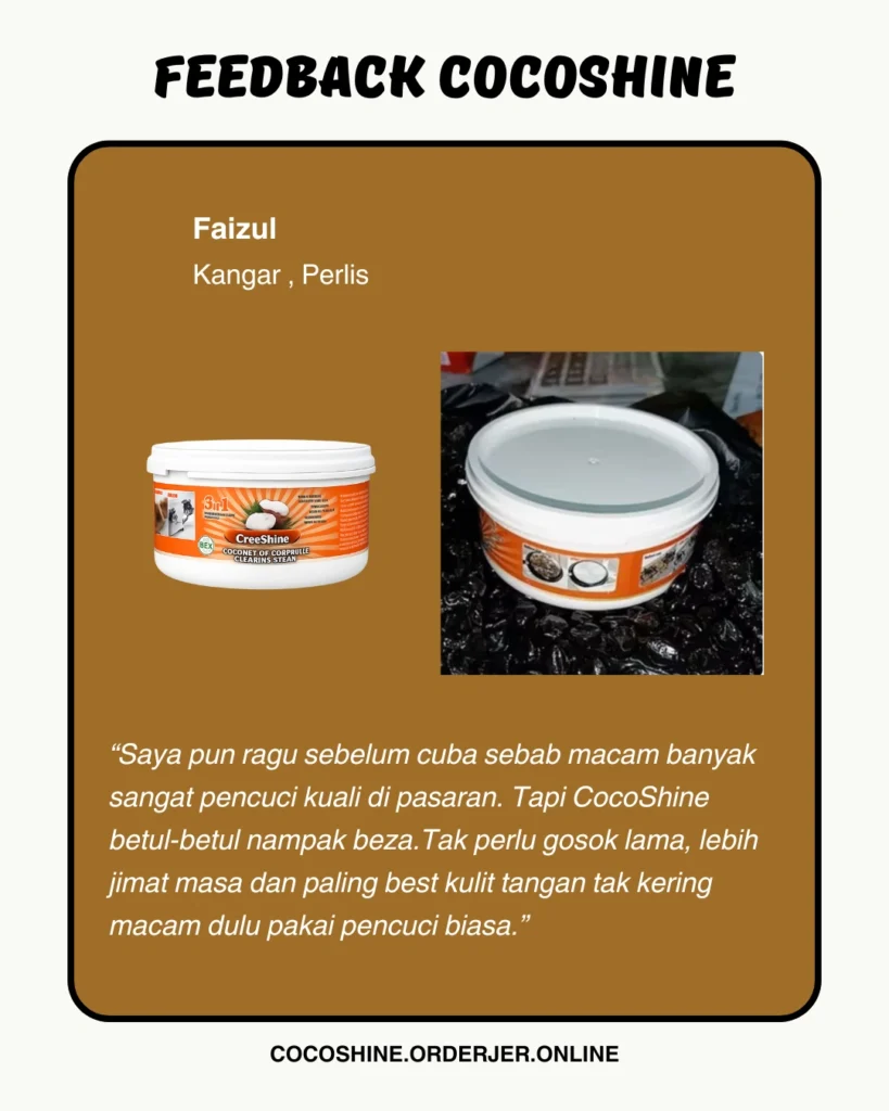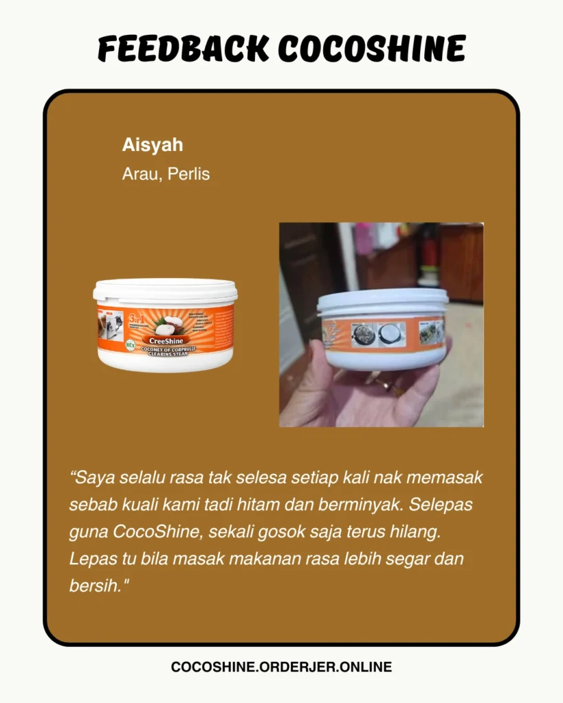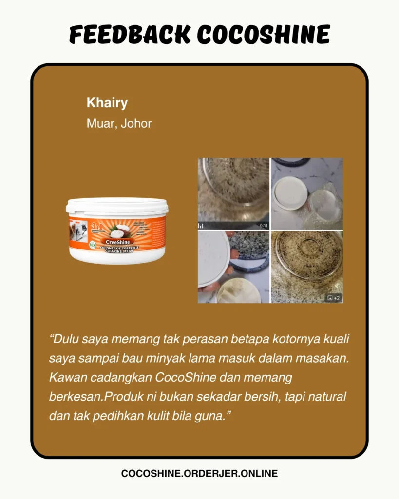 CocoShine hilangkan kerak hitam degil tanpa perlu gosok kuat.